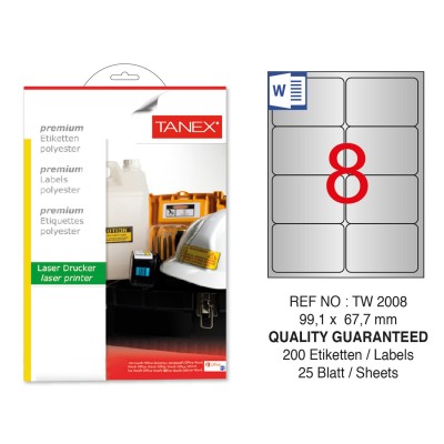 Tanex TW-2002 199.6x143.5mm Polyester Etiket 25 Li Tüm laser yazıcılar, fotokopi makineleri, renkli lazer yazıcıları ve renkli fotokopi makineleri içi..