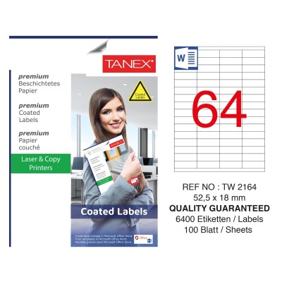 Bir çok alanda kullandığımız etiket çeşitleri arasında yer alan laser,renkli,termal,lojistik vb. etiket türleri kullandığımız alanlara göre değişmektedir. Sektörel bazlık kullanıma bağlı ihityacımıza göre belirlediğimiz etiket modelleri arasında yer alan Tanex Kuşe etiket ise hediyelik eşya, davetiye gibi sınırlandıramayacağımız bir çok sektörde kullanılmaktadır. Tanex markasının kalitesi ile üretilen kuşe etiketler laser yazıcılar ve kopyalıyıcılar için postalama,paket,ürün tanımlamaları ve diğer uygulamalara uygundur. Tanex TW-2164 52.5x18mm Kuşe Laser Etiket 100 Lü Paket Dünya standartlarındaki en son tabakalama teknolojisi ile üretimi yapılmaktadır.