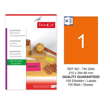 Tanex TW-2294 210x294,86mm Turuncu Floresan Laser Etiket 100 Lü