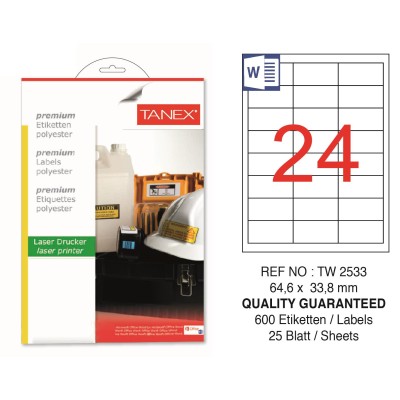 Tanex TW-2533 64.6x33.8mm Polyester Etiket 25 Li Tüm lazer yazıcılar, fotokopi makineleri, renkli lazer yazıcıları ve renkli fotokopi makineleri için mükemmel sonuç verir. İyi baskı için pürüzsüz ve düzgün yüzey. Soğuk ve nemli yüzeylerde bile hızlı ve güvenli yapışma. Çevre dostu ve sürdürülebilir FSC sertifikalıdır. Tanex Polyester etiketler dış mekan kullanımları için uygundur.Polyester olmaları nedeni ile çok sağlam ve kolay yıpranmazlar.