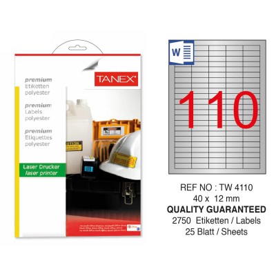 Tanex TW-4110 40x12mm Gümüş Lazer Etiket 2750 Li Tüm lazer ve mürekkep püskürtmeli yazıcılar, fotokopi makineleri, renkli lazer yazıcıları ve renkli fotokopi makineleri için mükemmel sonuç verir. İyi baskı için pürüzsüz ve düzgün yüzey. Soğuk ve nemli yüzeylerde bile hızlı ve güvenli yapışma. Çevre dostu ve sürdürülebilir FSC sertifikalıdır. Etiketler atık kağıt, geri dönüşümlü karton ambalaj ile %100 geri dönüştürülebilir.